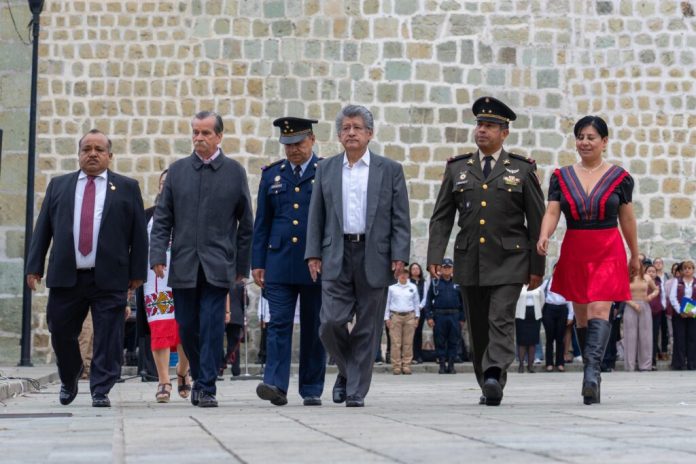 Oaxaca de Juárez, Oaxaca, a 9 de septiembre de 2024.- El Presidente Municipal de Oaxaca de Juárez, Francisco Martínez Neri encabezó la Ceremonia de Izamiento y Honores a la Bandera, como parte del Programa Cívico “Septiembre, mes patrio”, que fue organizado en esta ocasión por la Coordinación de Ciudad Educadora del Gobierno Municipal.